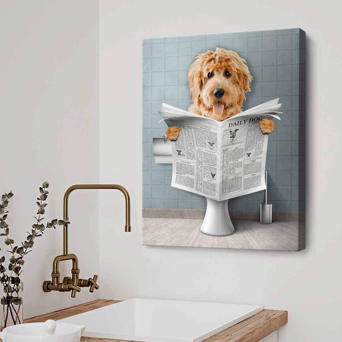 Dog Read Newspaper in Toilet Portrait Canvas, Personalized Pet Portrait, Funny Pet Portrait, Pet Customization, Kids Bathroom Wall Art