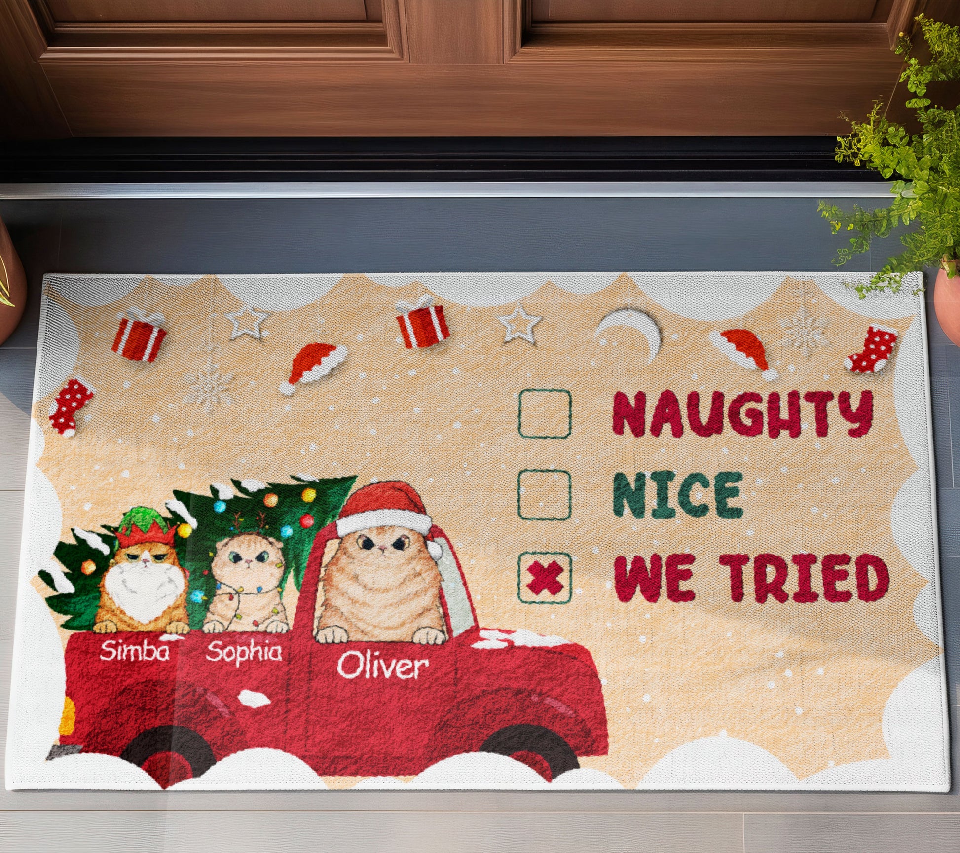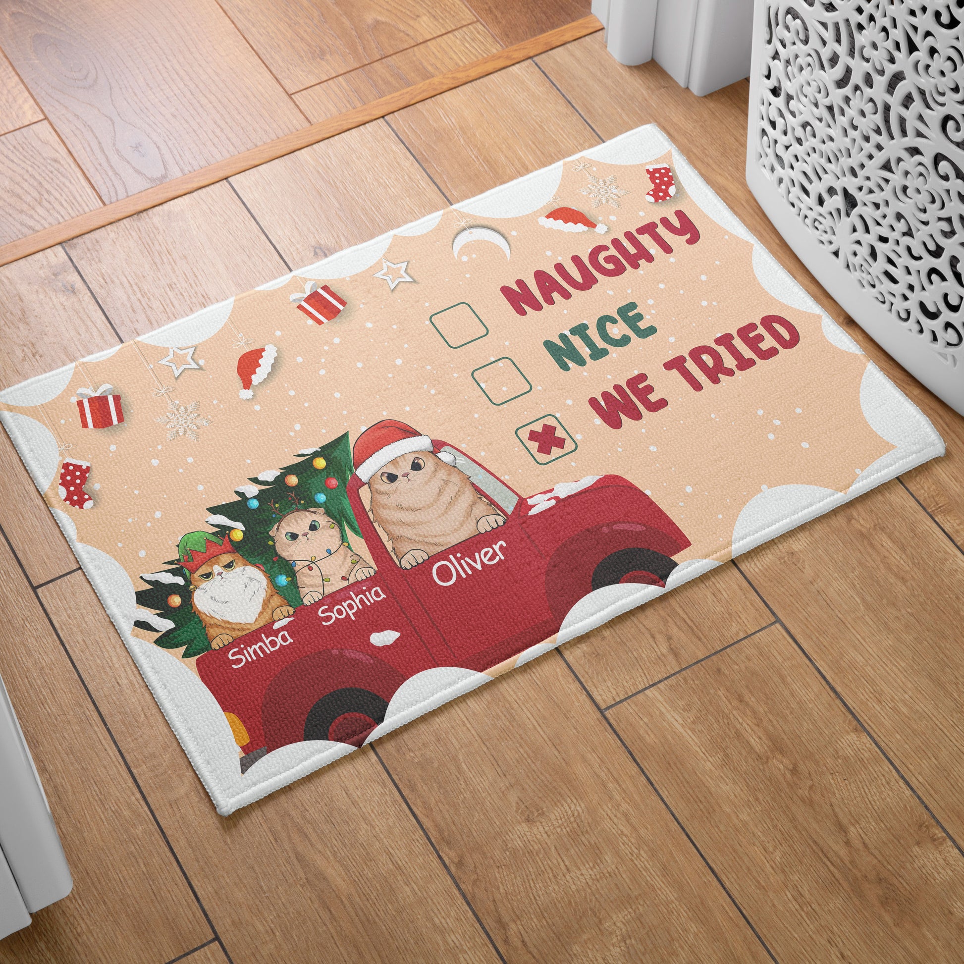 Naughty Nice We Tried Cat Lover v3 Doormat, Cat Personalized Home Decor Mat, Xmas Gift For Cat Owners, Pet Lovers Gift Idea